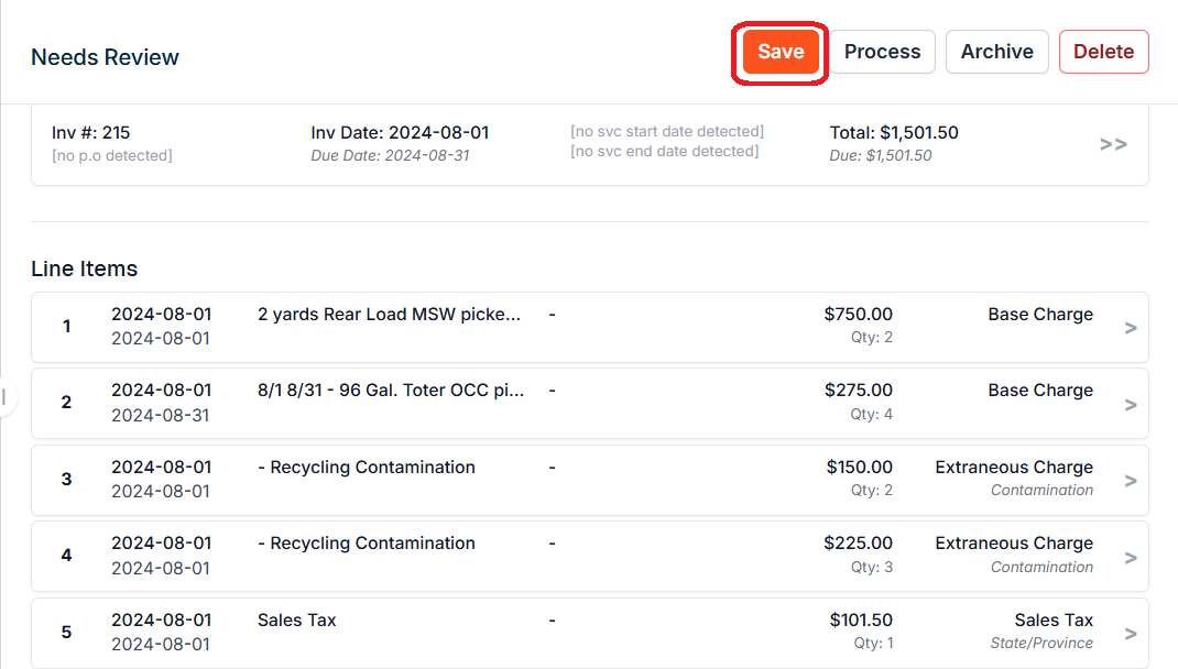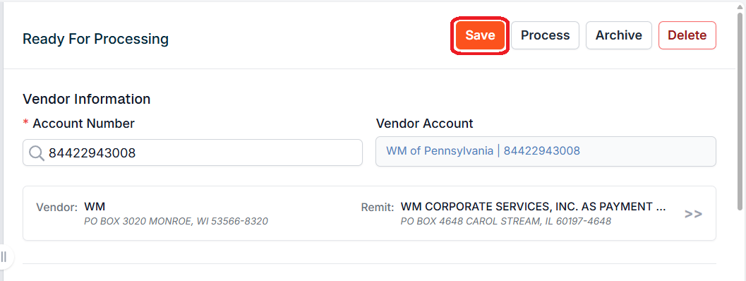 NOTE: Discovery's Auto Process feature reduces manual input by auto processing extracted invoices that meet the required criteria. Invoices that need review can be processed by resolving any errors and simply clicking the "Save" button.