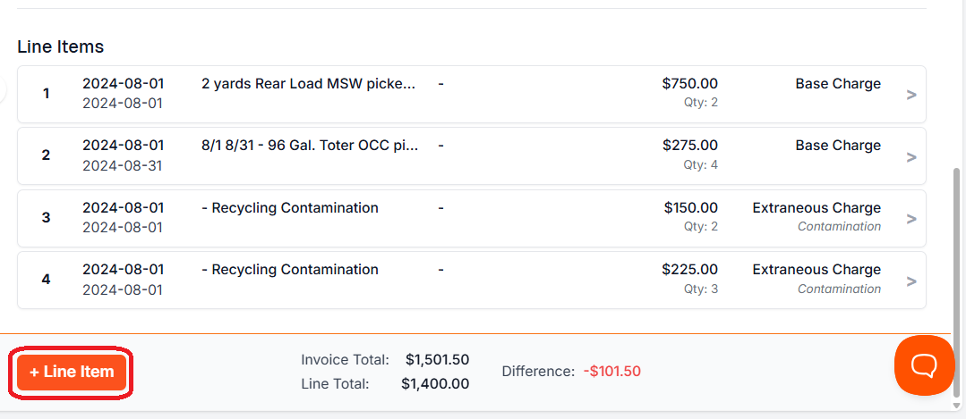 - On the Extracted Invoice edit page, click the orange "+ Line Item" button.