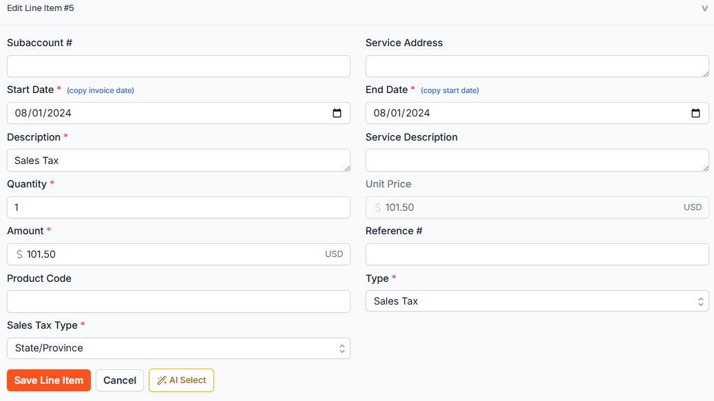 - The last line item on the invoice is a sales tax line item with an amount of $101.50. This line item was missed in the extraction step and needs to be added.