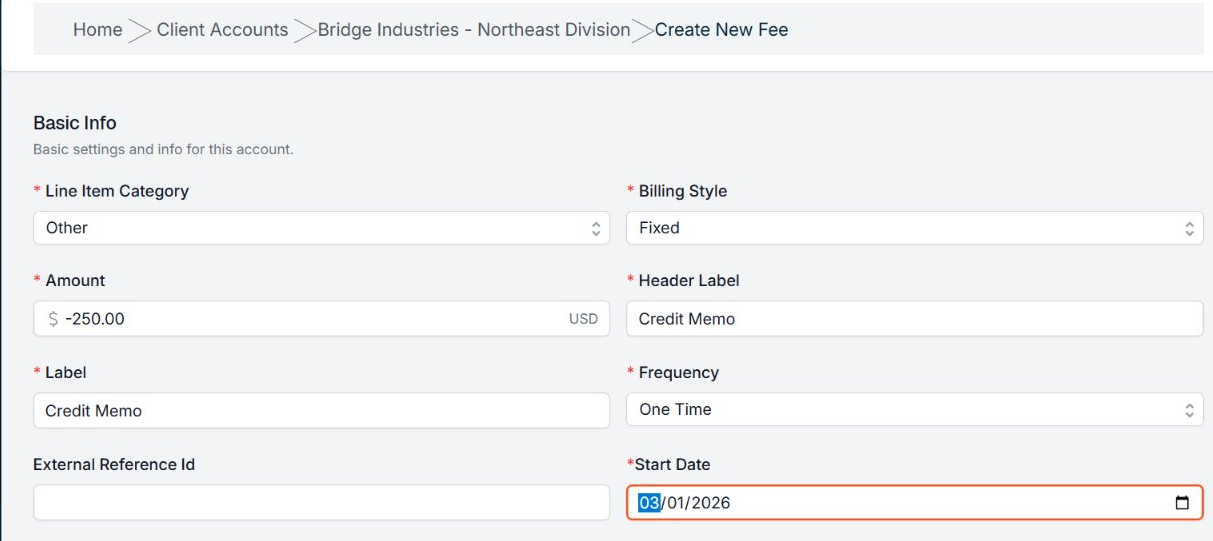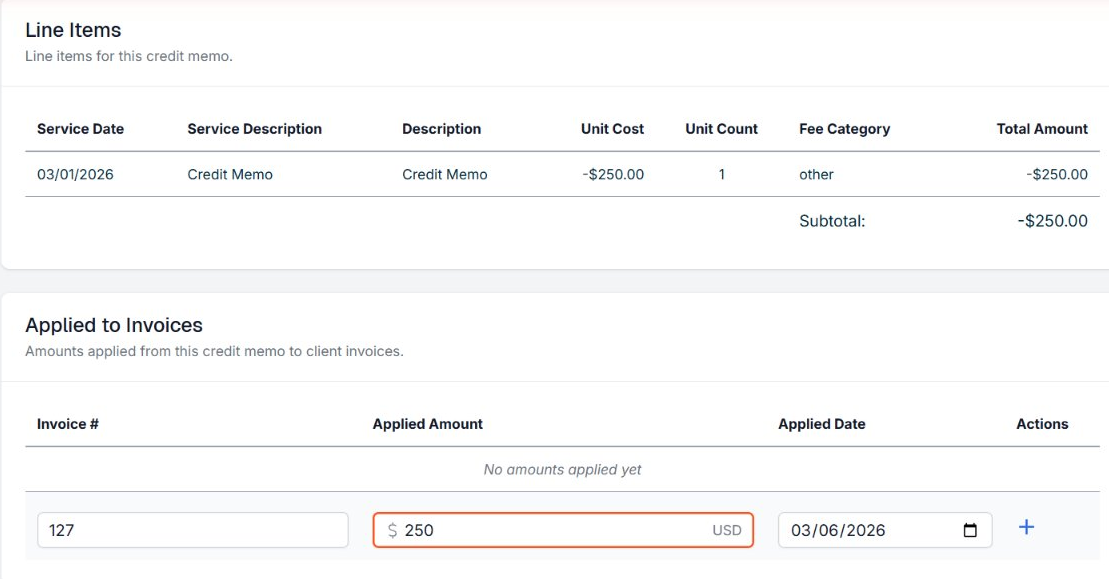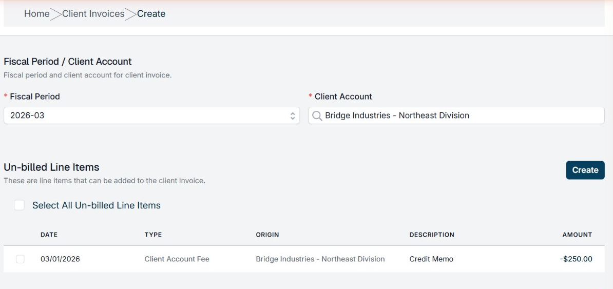A Credit Memo can originate as a negative Fee Line Item. This is very important. There are a few methods to accomplish this, but in most cases we suggest establishing a one-time Client Account fee that can be converted into a Credit Memo later on.