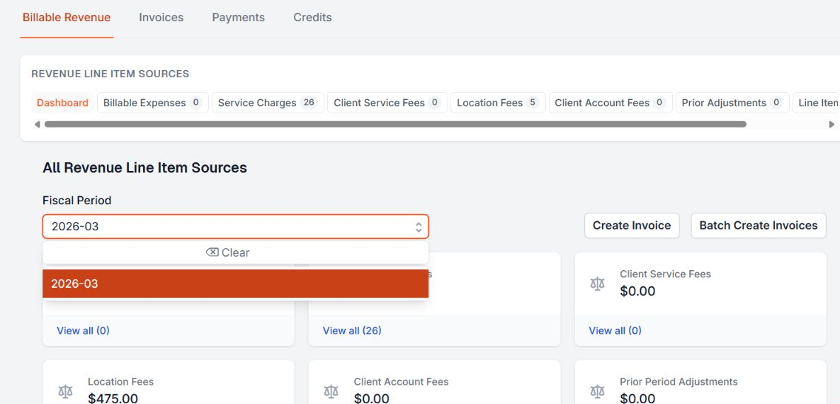 Navigate to Revenue in the main navigation and select Billable Revenue. Use the fiscal period selector to navigate to the period that matches the fee's start date.
