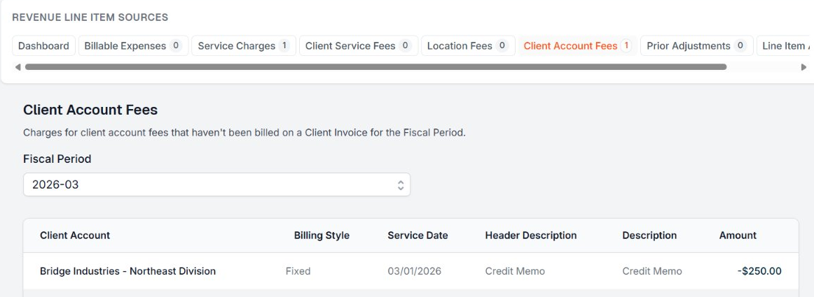 Credit memos can be generated via fees or Client Line Item Adjustments.