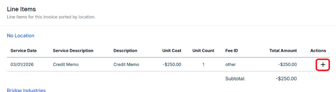Scroll to the Line Items section of the invoice. Locate the negative Credit Memo line item. Click the + icon to the right of it.