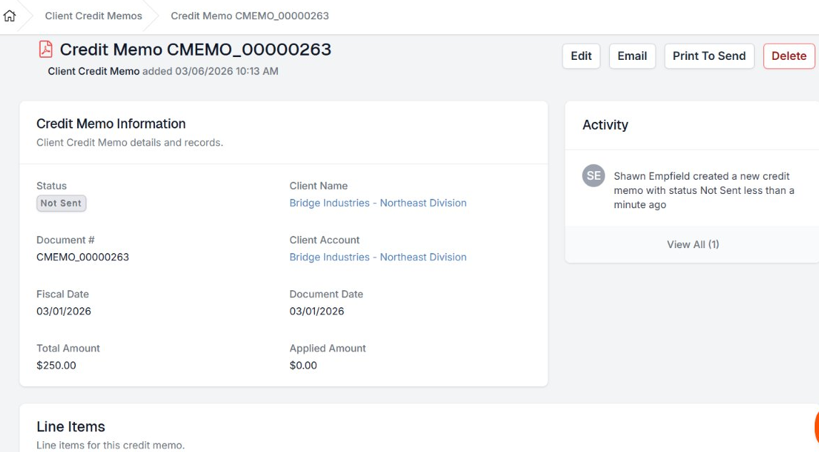 You are now on the Credit Memo record. Review the Credit Memo Information section to confirm the document number, client account, and total amount are correct.