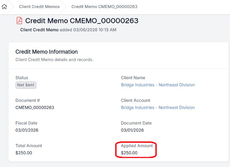 - Total Credit Memos Applied shows the credited amount