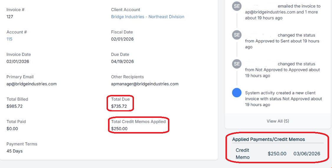 Credit Memos operate similarly to Client Payments, reducing the outstanding amount on an invoice. However, the process to issue a Credit Memo differs.