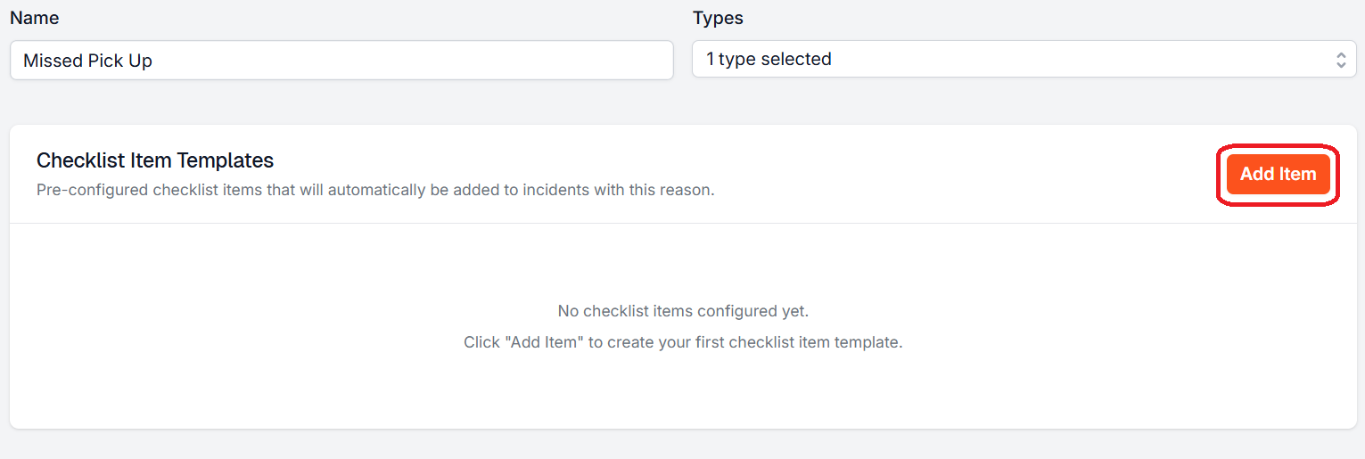 - On the Incident Reason edit page, under Checklist Item Templates, click on Add Item.