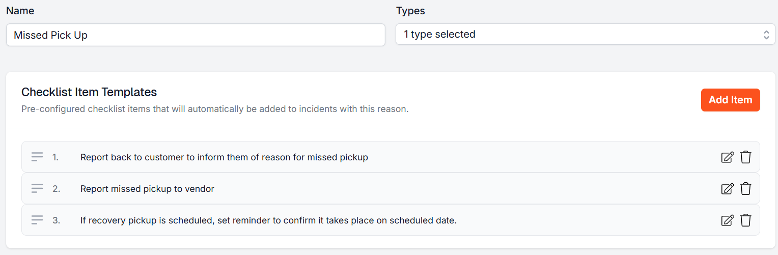 For example, if “Missed Pickup” always requires the same verification and communication steps, you can attach those steps to that reason so they appear automatically on new incidents.