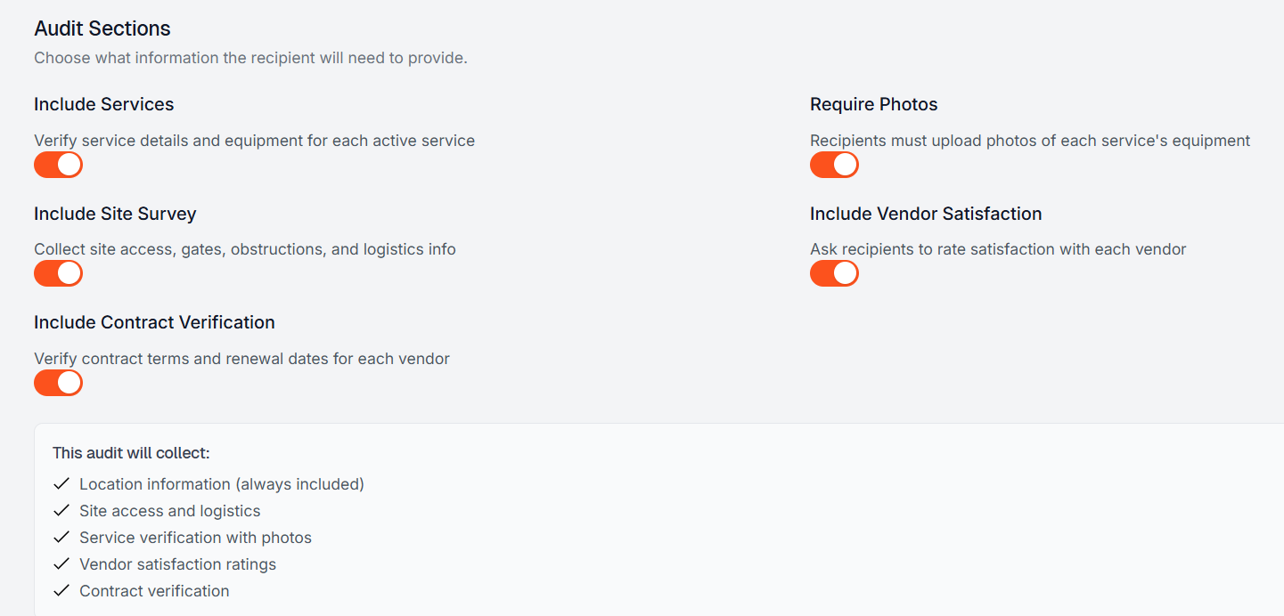 - Use the toggles to confirm which Audit Sections you would like the customer to complete.