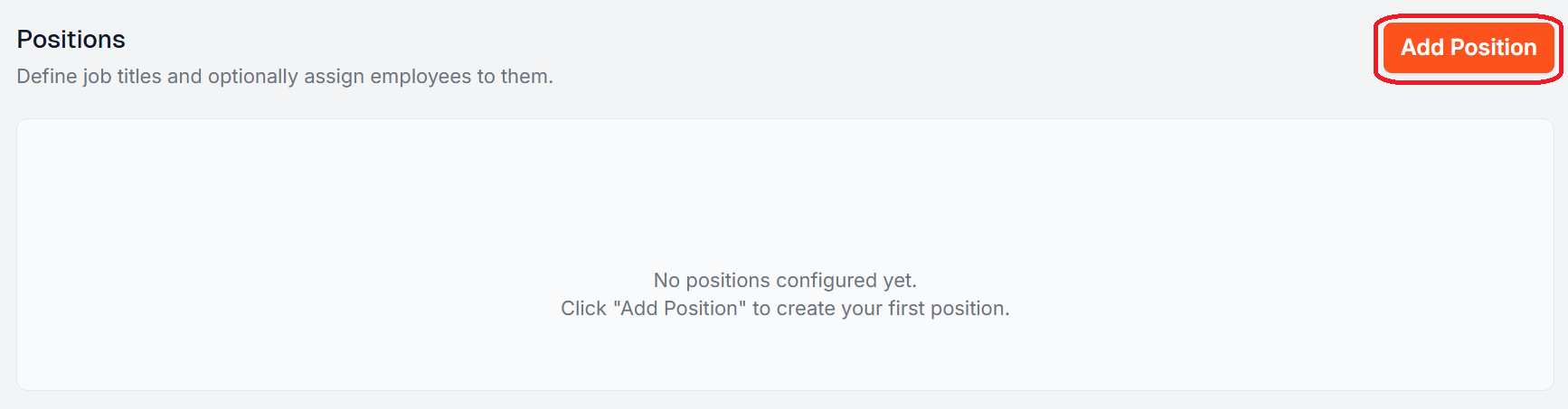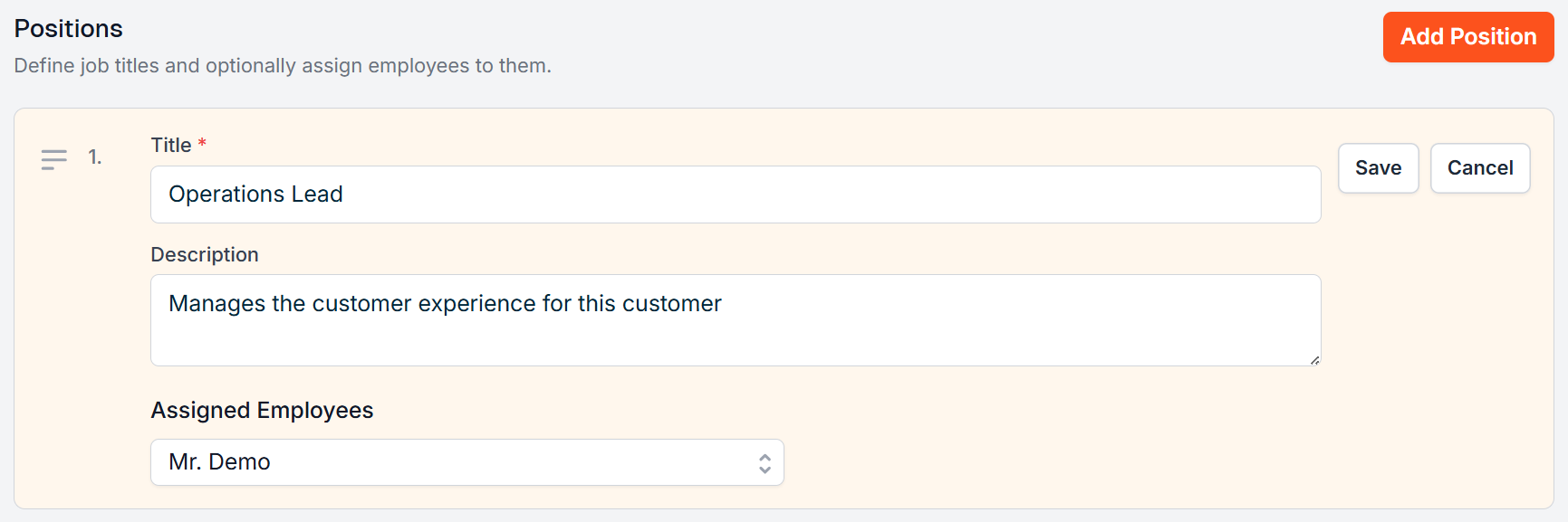 - Add one or more positions to the Team, including a title, optional description, and any employee assignments