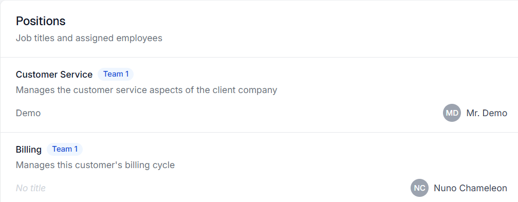 Positions appear in the Positions summary on the Client Company page, with assigned users listed beneath each title. Positions applied from a Team are marked with an indicator showing their source Team. You can: