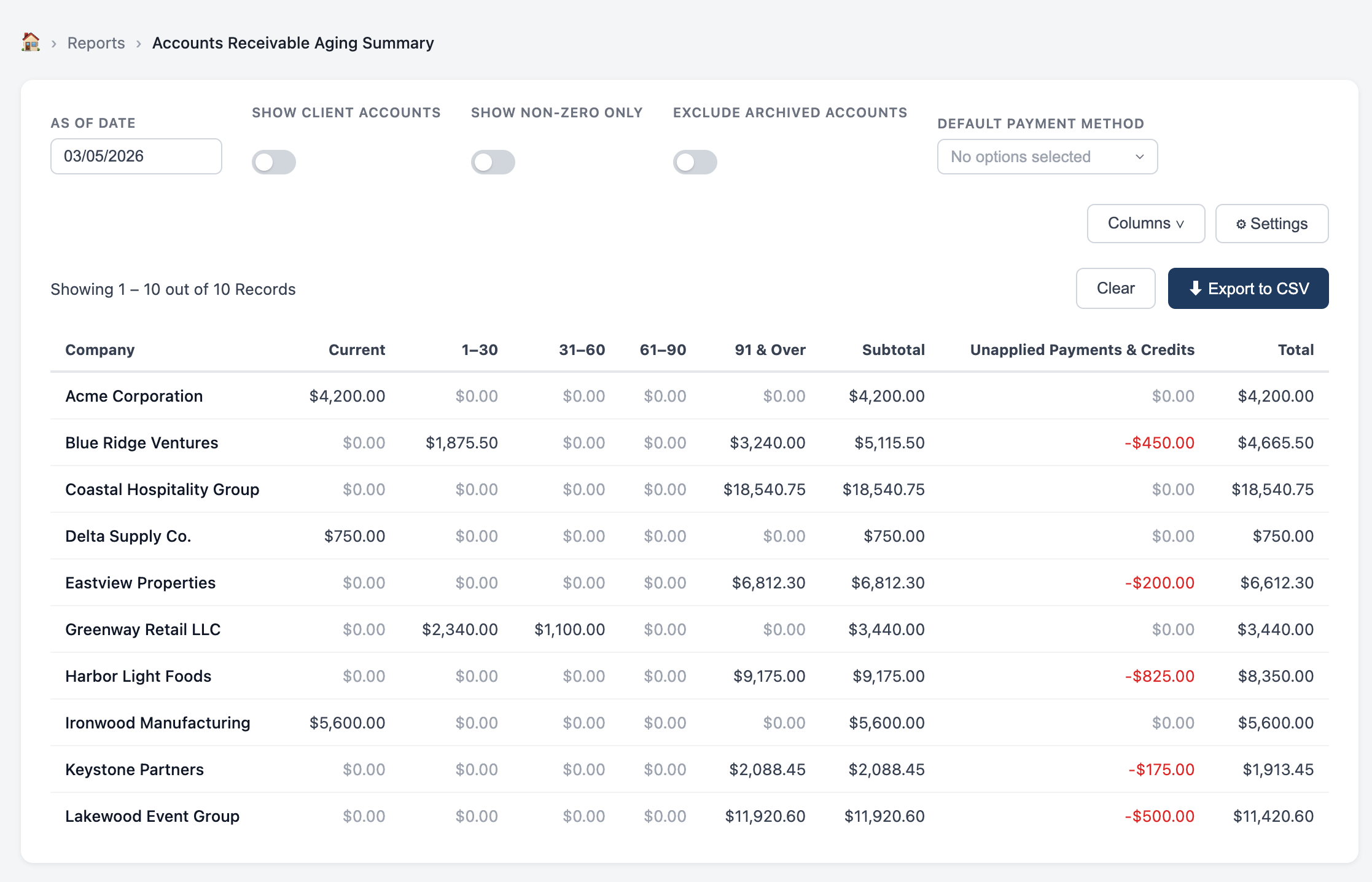 The Accounts Receivable (A/R) Aging Summary Report helps you monitor outstanding customer balances and track how long invoices have remained unpaid.