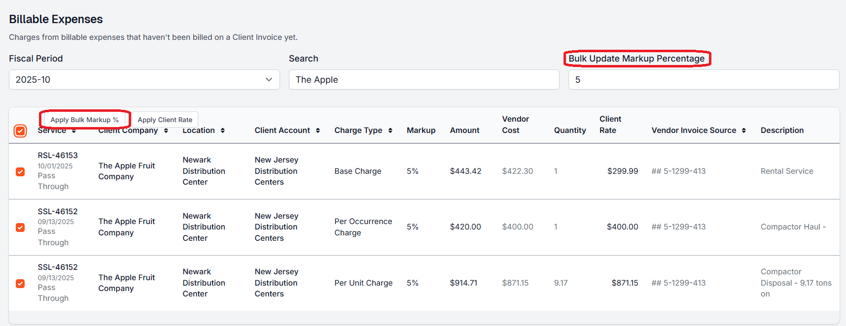 Bulk markups can be applied by setting a bulk markup percentage and then bulk selecting the expenses you which to apply it to: