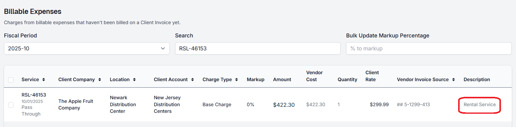 - Service - This is the Service that was charged on the Vendor Invoice that the Billable Expense originated from.